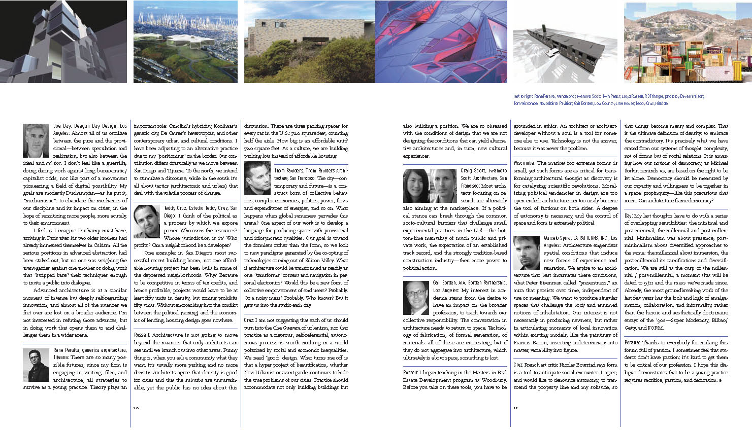 Aquí esta una charla que se llevo acabo vía Internet para la revista ArcCA, publicación del colegio de arquitectos del estado de California. Las preguntas y edición la hizo Peter Zellner. Una versión editada se publicara este mes. Esta versión es la original, sin edición.