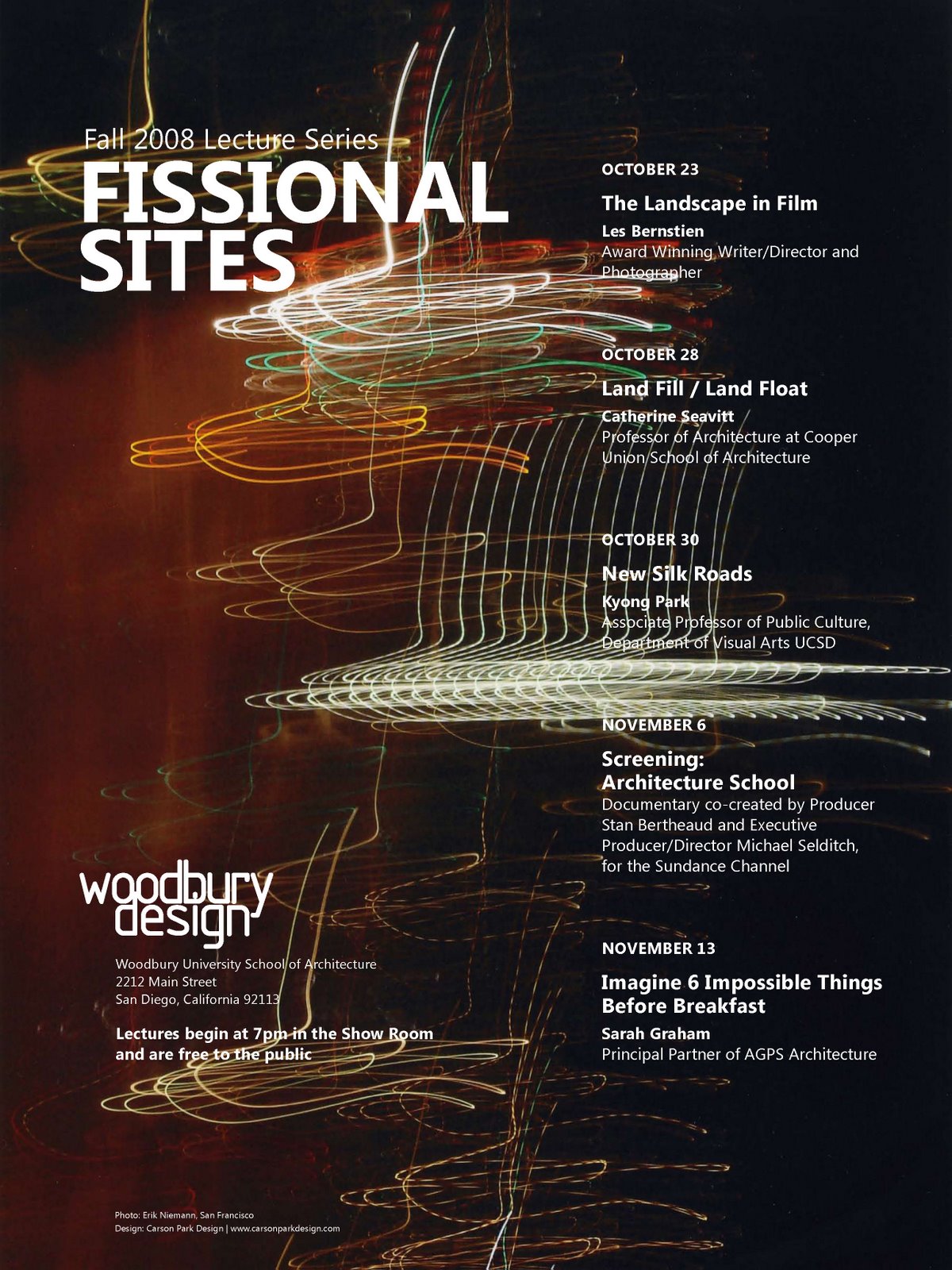 Aqui esta el poster y la lista de conferencistas para el ciclo de conferencias de Woodbury en San Diego. Este año me toco organizar el evento e invitar a los participantes. El poster fue diseñado por Carson Park Design de SF y la imagen es de mi amigo y ex compañero de escuela Erik Niemann. Ahi los esperamos.