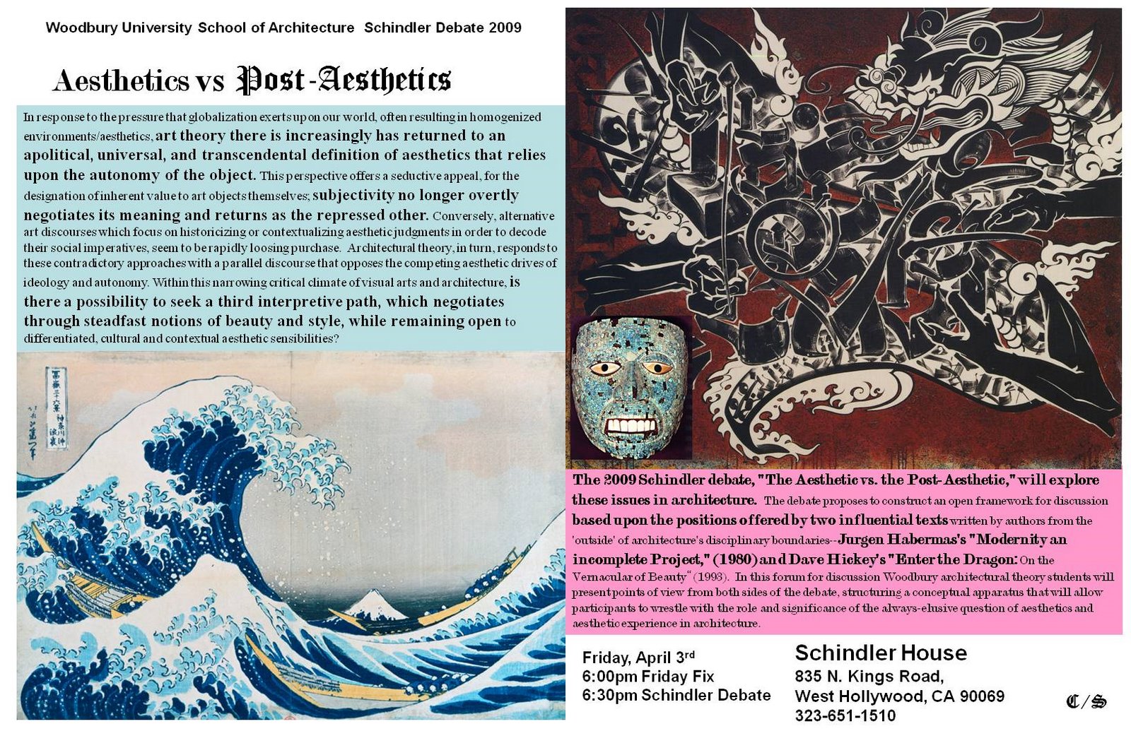 The 2009 Schindler debate, “The Aesthetic vs. the Post-Aesthetic,” will explore these issues in architecture. The debate proposes to construct an open framework for discussion based upon the positions offered by two influential texts written by authors from the ‘outside’ of architecture’s disciplinary boundaries–Jurgen Habermas’s “Modernity an incomplete Project,” (1980) and Dave Hickey’s “Enter the Dragon: On the Vernacular of Beauty“ (1993). In this forum for discussion Woodbury architectural theory students will present points of view from both sides of the debate, structuring a conceptual apparatus that will allow participants to wrestle with the role and significance of the always-elusive question of aesthetics and aesthetic experience in architecture.\