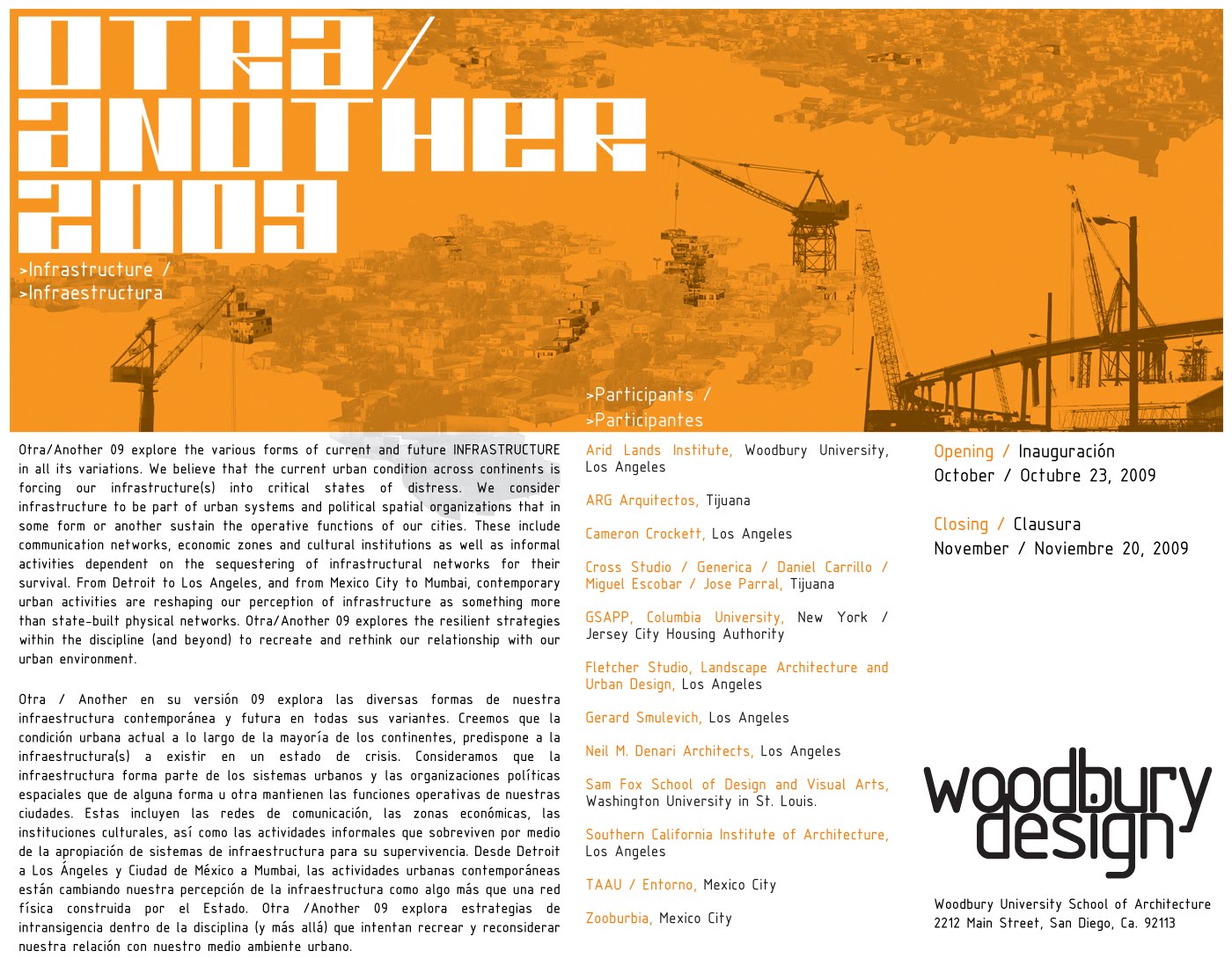 Otra / Another en su versión 09 explora las diversas formas de nuestra infraestructura contemporánea y futura en todas sus variantes. Creemos que la condición urbana actual a lo largo de la mayoría de los continentes, predispone a la infraestructura(s) a existir en un estado de crisis. Consideramos que la infraestructura forma parte de los sistemas urbanos y las organizaciones políticas espaciales que de alguna forma u otra mantienen las funciones operativas de nuestras ciudades. Estas incluyen las redes de comunicación, las zonas económicas, las instituciones culturales, así como las actividades informales que sobreviven por medio de la apropiación de sistemas de infraestructura para su supervivencia. Desde Detroit a Los Ángeles y Ciudad de México a Mumbai, las actividades urbanas contemporáneas están cambiando nuestra percepción de la infraestructura como algo más que una red física construida por el Estado. Otra /Another 09 explora estrategias de intransigencia dentro de la disciplina (y más allá) que intentan recrear y reconsiderar nuestra relación con nuestro medio ambiente urbano.