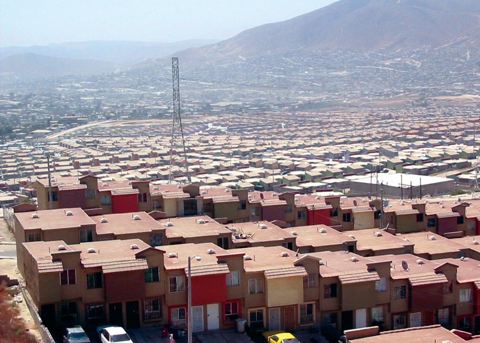 To the east of Playas de Tijuana there is a whole different and defiant world within the city known as the Laureles Canyon. Laureles is part of the 33-canyon system in the Tijuana River watershed and the archetype of of informal settlement on the steep hillsides common throughout the city. In contrast to Playas, the Laureles Canyon community is made up of low-income units of illegal origin inhabited by low-wage workers employed by local manufacturing plants (maquiladoras). According to the Tijuana Municipal Planning Institute there are approximately 80,000 people living in the canyon. The predominant housing type consists of self-built homes constructed with a variety of recycled materials that come from the US. Most of these homes are built on steep slopes, using old tires as retaining systems, planters and staircases that together provide access to the many canyon-side homes. Most of the settlers work in formal economies, such as manufacturing plants, so they are entitled to government services. Yet since wages in the maquiladoras are very low, many residents participate in informal economies such as home-based child care, food preparation, and many other business that serve the immediate community. The accelerated population growth of Tijuana (6% per year) and the demand for almost 70,000 new low-incomes homes every year have encouraged developments that lack sewage and street paving, built primarily in high-risk natural landscapes. The general lack of government intervention and oversight has brought about a series of housing development types ranging from squatter settlements, private-developer housing, and even government-relocated communities from other high-risk areas of the city.