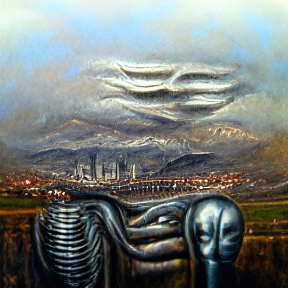 In the background, the city crouching on distant hills dissipating under a gray mist of a cold morning. There is no sign or sigh of human life. Painting by HG Giger