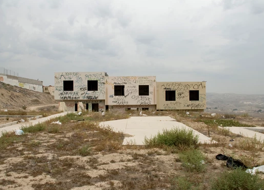 This photograph hides nothing. The photograph makes visible the absence of a home. Three rectangular structures of derelict or still borne houses are centered in the composition, each with two dark square openings as if staring back at the viewer. In the foreground, a landscape of dead lawn patches and a few invasive greeneries create a datum for the aborted homes. In the background, the city crouching on distant hills dissipating under a gray mist of a cold morning. There is no sign or sigh of human life. The landscape is desolate. The only fragment of urbanity is a semi-finished perimeter wall of an adjacent gated community displaying a couple of insipid graffiti tags.