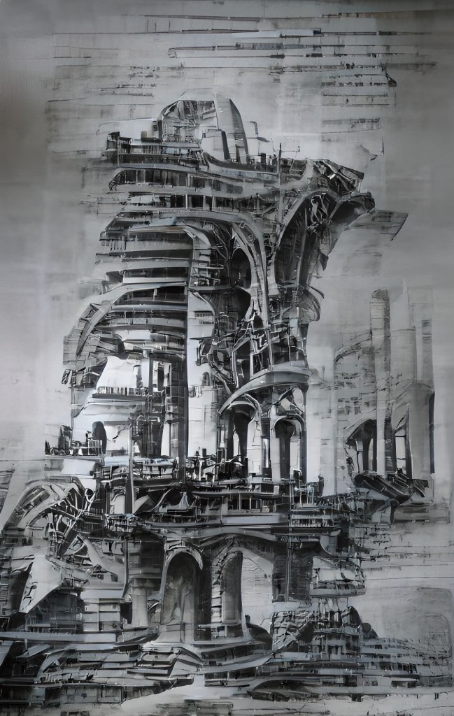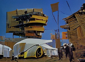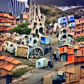 These days I am experimenting with some sites that use neural networks or artificial intelligence as they call it to create images based on text. In the first image, I typed words that had to do with the informal city and Syd Mead’s graphics. This is what the neural network created after 2000 iterations.