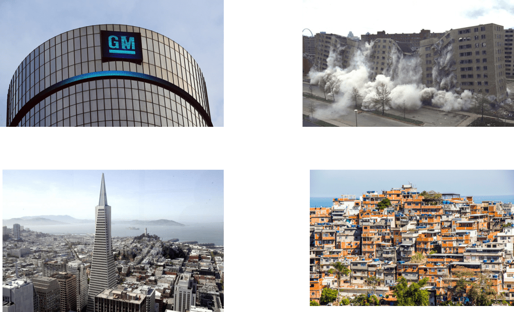 GM Renaissance Center. John Portman 1973. Transamerica Pyramid. William Pereira. 1969. Pruitt Igoe. Minuro Yamasaki 1956. Favela in BrazilMoreover, around the globe, the questions of horizontality become superseded by questions of verticality. “Since the 1980s, urban space has become more and more walled off with the middle- and upper-income classes increasingly residing in what have been termed fortified enclaves, while the poor remain in either slums or favelas”. Herzog