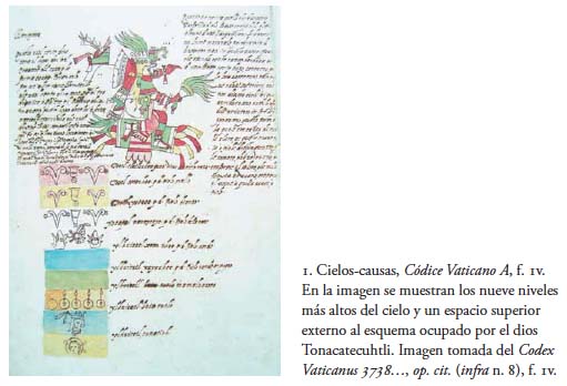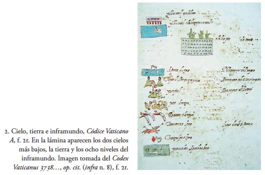 “The layered cosmos of ancient Aztecs of central Mexico is a skyscraper with 13 upper stories that share the floor at ground level with the nine basements. This universe’s levels are identified and illustrated in Codex Vaticanus A, or Codex Rios, a sixteenth-century manuscript written in Italian and thought to be a copy of a lost indigenous original. The treatise deals with Aztec religion, history, customs, and calendar (Illustration Griffith Observatory, Joseph Bieniasz, after Codex Vaticanus A.”