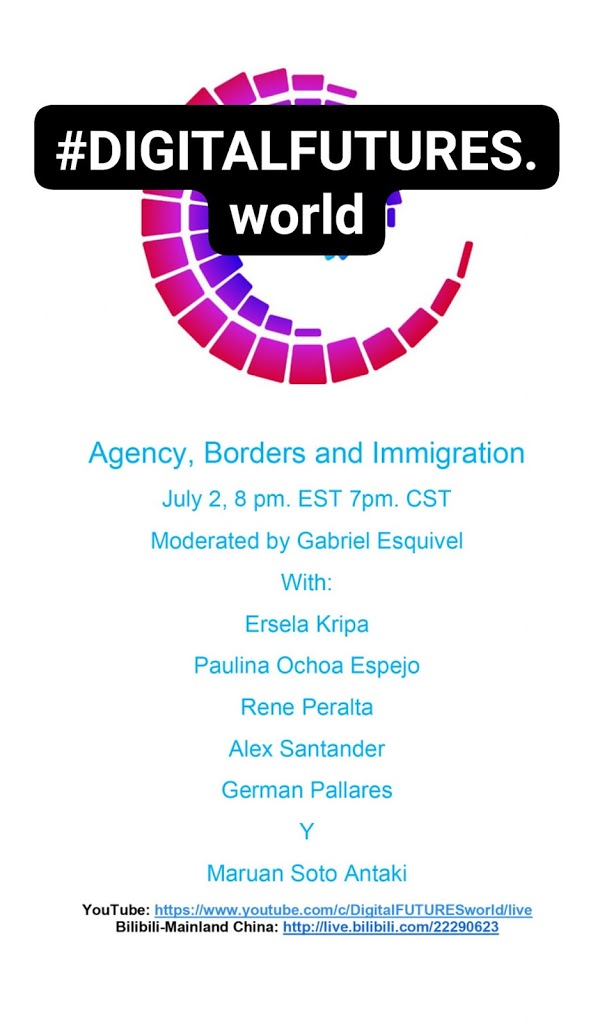 This Thursday, July 2 at 8pm EST 7pm CST. Agency, Borders, and Immigration. US-Mexico Border. Conversation with Ersela Kripa, Rene Peralta, Paulina Ochoa Espejo, Alex Santander, German Pallares, and Maruan Soto Antaki. Follow the Youtube link. https://www.youtube.com -