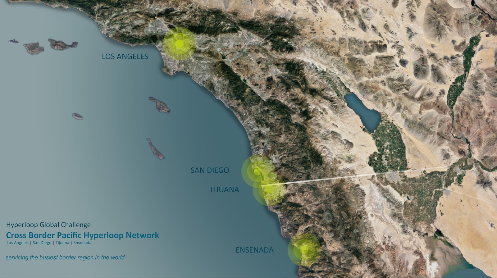 Nuestro Equipo Hyperloop One acaba de presentar en Washington DC una propuesta para implementar la tecnología de Hyperloop en la region Los Angeles – San Diego como primera etapa y luego extenderse a Ensenada. Los tiempos serian LA a SD en 12.5 minutos y LA a Ensenada en 20 minutos.